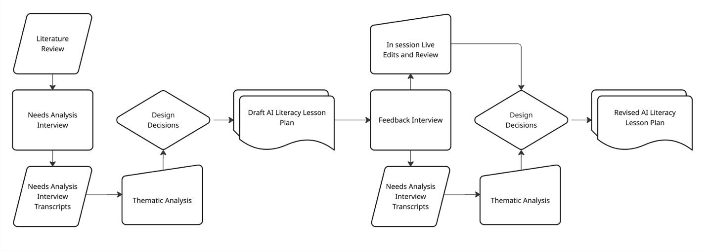 The design process (Figure 2) began with a scope and needs analysis in which the team conducted an extensive literature review on AI literacy, reviewed content analysis of existing guidelines, and led semi-structured interviews with key stakeholders. During the interviews, stakeholders contributed their expertise and insights into student needs. This feedback guided the design decisions.