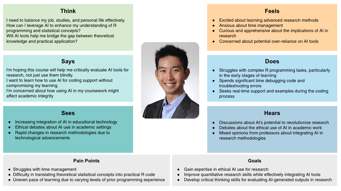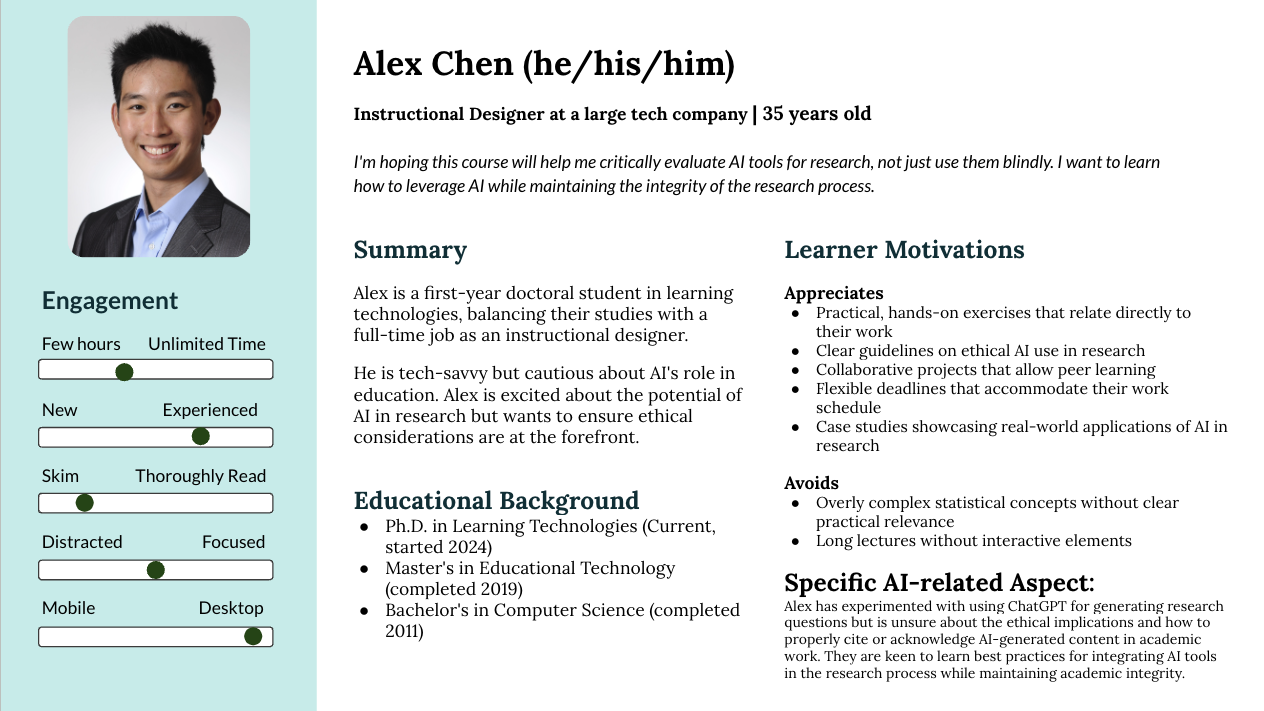 ChatGPT was prompted with instructions informed by the empathy map and interviews from the 'Care About' phase. These findings highlighted key challenges, such as the reliance on real-time support and ethical concerns surrounding GenAI in research. Then, the ID team conducted a critical review to ensure these outputs aligned with the course's ethical and pedagogical goals. The IDers and professor reviewed the outputs, identifying areas where the GenAI lacked nuance or failed to capture the full complexity of student needs, especially regarding ethical concerns. The team adjusted the learner journeys and personas, ensuring that they addressed both technical and ethical dimensions. For instance, the persona of Alex Chen (Figure 2), a first-year doctoral student interested in ethical AI use, was refined to more comprehensively address concerns about bias mitigation, academic integrity, and the responsible use of GenAI in research.