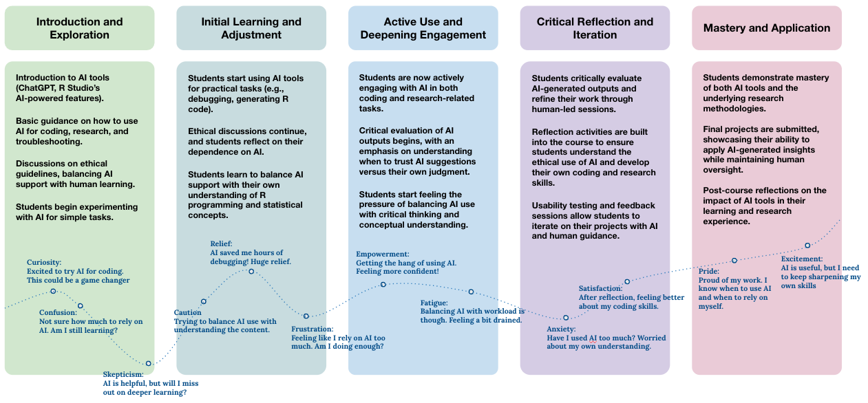 The course design addresses challenges in GenAI integration, including ethical use, academic integrity, and fostering critical thinking, while accommodating diverse student backgrounds in R programming and research methodologies. This redesign uses Tronto’s care ethics framework and User Experience (UX) methods to ensure a balance between GenAI integration and human oversight. This approach centers around creating inclusive and equitable learning experiences, where GenAI enhances student engagement without compromising ethical standards. Table 1 outlines how the phases of care ethics align with the UX methods and the ongoing involvement of human oversight to ensure both ethical and effective use of GenAI.