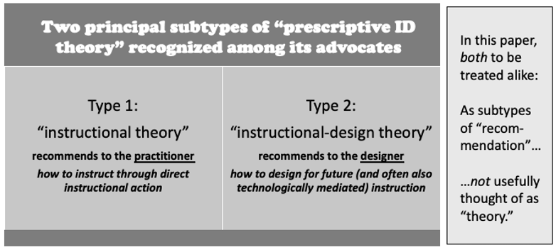 The distinction between these two kinds of knowledge products is useful and well-taken. However, for the purposes of the present argument: they will be treated alike as putative theory-types in ID which are both better understood as subtypes of ID “recommendation.” Because this paper is chiefly concerned with critiquing this point of similarity between them, it will use the phrase “prescriptive ID theory” to refer equally to both.